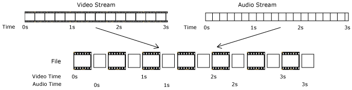 To understand how a decoder works, we need to know how a video file is organized. Conceptually, a media file consists of one or more streams of data - for example, a typical file will contain a video, an audio and perhaps a subtitle stream. These streams are subdivided into chunks of data called packets. As shown in the figure below, streams are interleaved in the file so packets that should be decoded at a similar time are close to each other.