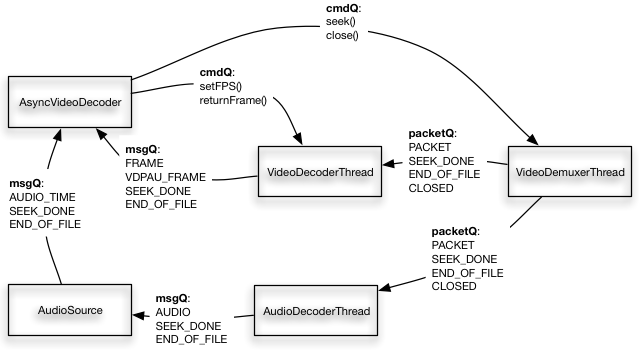 As can be seen in the figure above, a seek is initiated when the appropriate command is sent to the demuxer. The demuxer does the seek in the stream and sends SEEK_DONE messages that cascade through the threads. A thread that sends a SEEK_DONE always precedes this by clearing its outgoing message queue(s) - packets, video frames and audio data in these queues are now obsolete and can be discarded.
